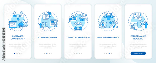Editorial calendar advantages blue onboarding mobile app screen - walkthrough 5 steps editable graphiWall mural