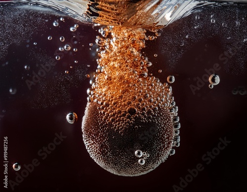 Wall mural effervescent cola explosion underwater dark bubbles rising against inky background dynamic liquid te