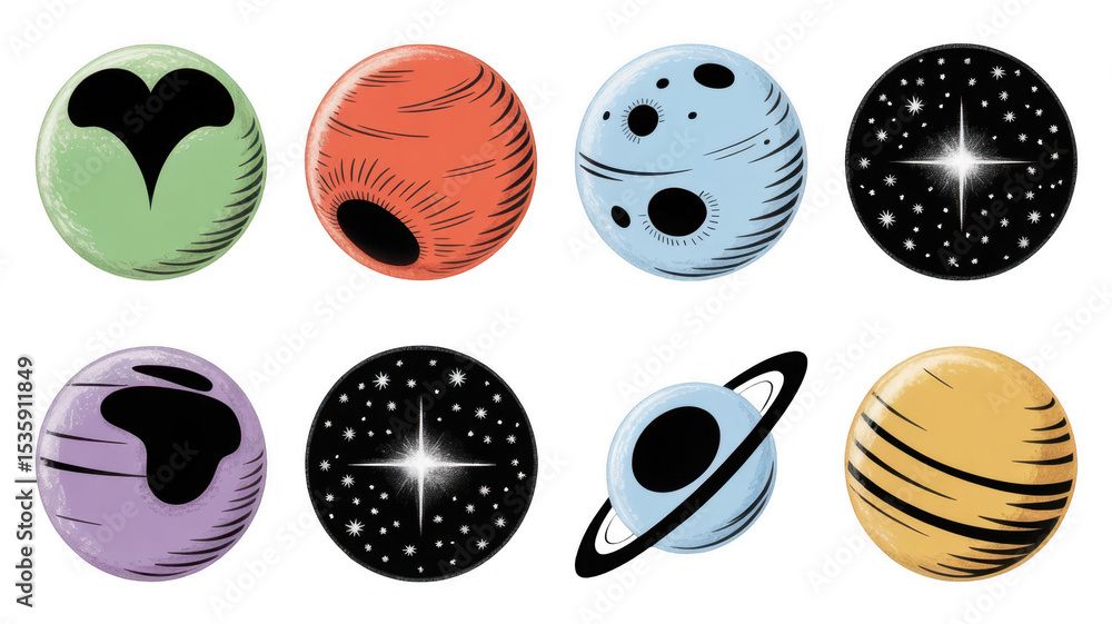 Wall mural eight colorful planets and twinkling stars float on a transparent background, creating a whimsical a - Wall murals Wall mural eight colorful planets and twinkling stars float on a transparent background, creating a whimsical a - Wall murals