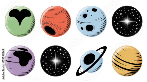 Wall mural eight colorful planets and twinkling stars float on a transparent background, creating a whimsical a