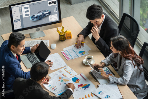 The watermark will not be included on Wall mural.: Electric car design software on computer screen showing simulation blueprint snugly by digital calcu