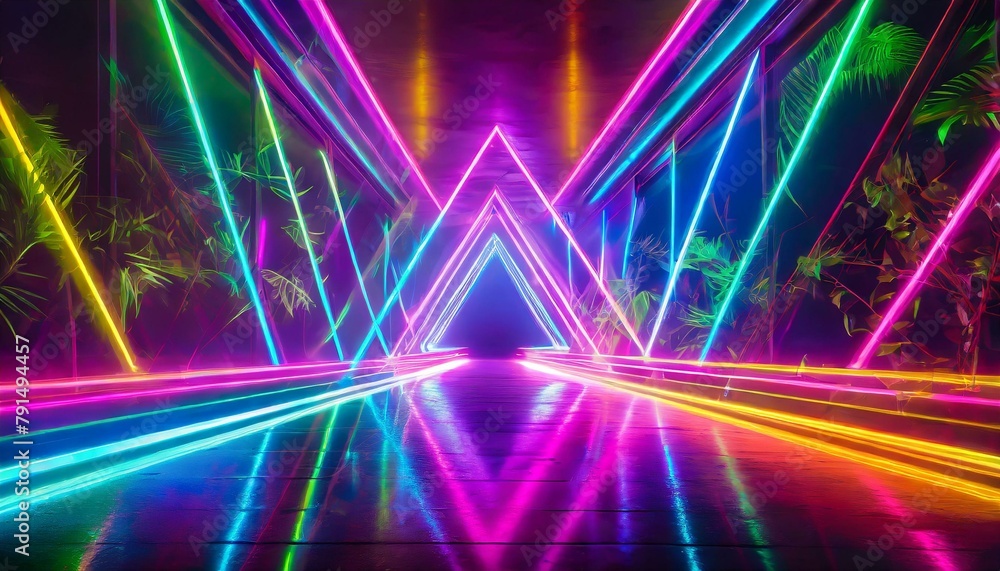 Wall mural electrifying geometry: abstract neon light background illuminated with vibrant lines texture backgro