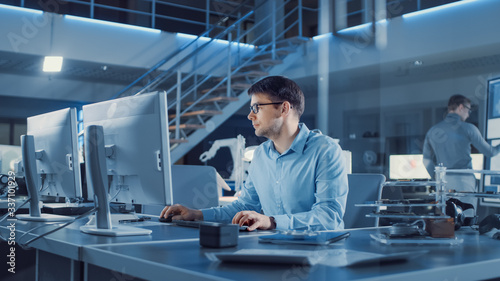 The watermark will not be included on Wall mural.: Electronics development engineer sitting at his desk uses personal computer for programming - team of