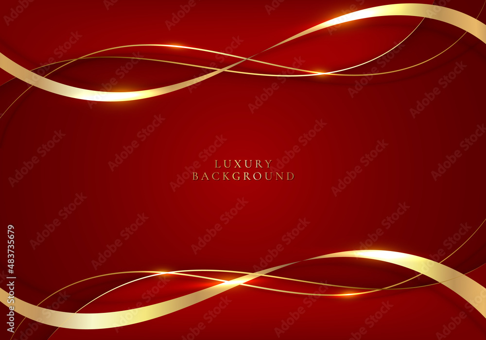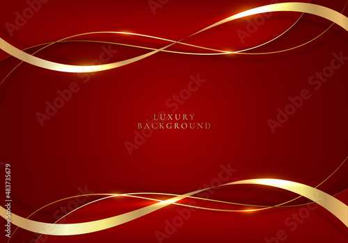 Wall mural elegant 3d abstract golden ribbon and wave lines on red background