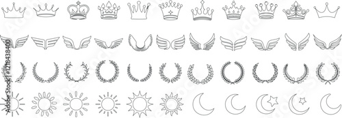 Wall mural : Elegant crowns, wings, laurel wreaths, sun, moon, and star icons in minimalist vector design - perfec