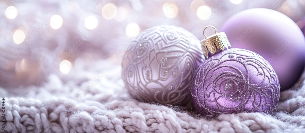Wall mural elegant lilac christmas ornaments with intricate patterns resting on a soft knitted background illum - Wall murals Wall mural elegant lilac christmas ornaments with intricate patterns resting on a soft knitted background illum - Wall murals