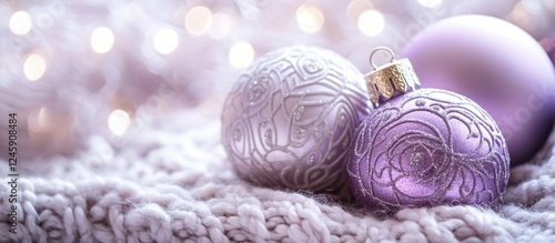 Wall mural : Elegant lilac christmas ornaments with intricate patterns resting on a soft knitted background illum