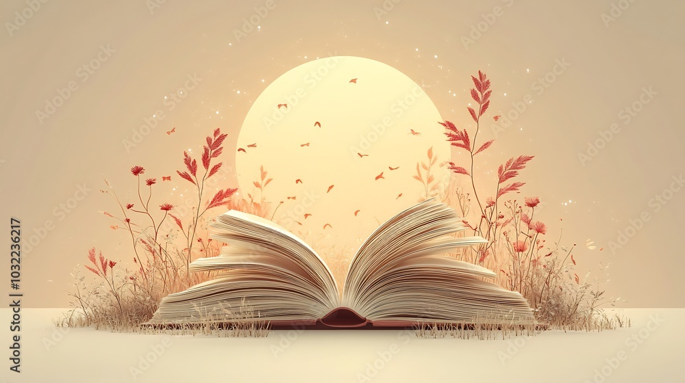 Wall mural : Elegant world book day concept showcasing a stylized open book with delicate line art and subtle gra