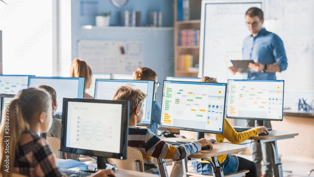The watermark will not be included on Wall mural.: Elementary school science classroom: teacher educates smart little schoolchildren who work on person