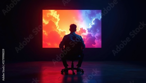The watermark will not be included on Wall mural.: Empty chair facing a glowing screen, dark room , internet, network, purple