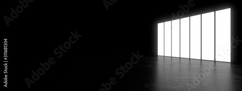 Wall mural empty dark space illuminated by a large rectangular lamp. blurry reflections on the concrete floor.