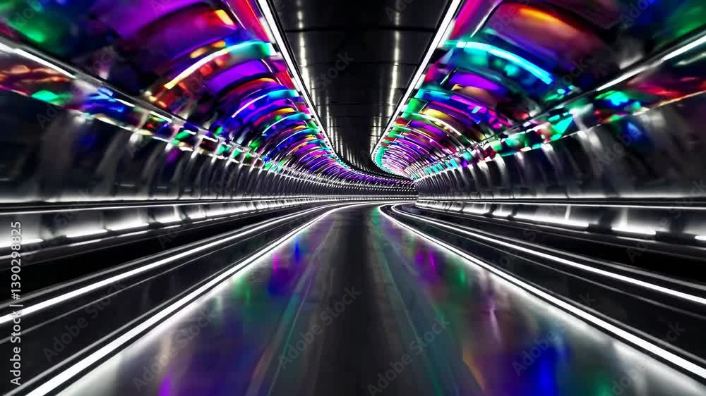 Wall mural : Empty futuristic tunnel with moving walkways and colorful led lights creating a vibrant and modern a