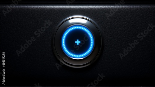 Wall mural empty illuminated button isolated on black leather background with copy space, steel button mock up