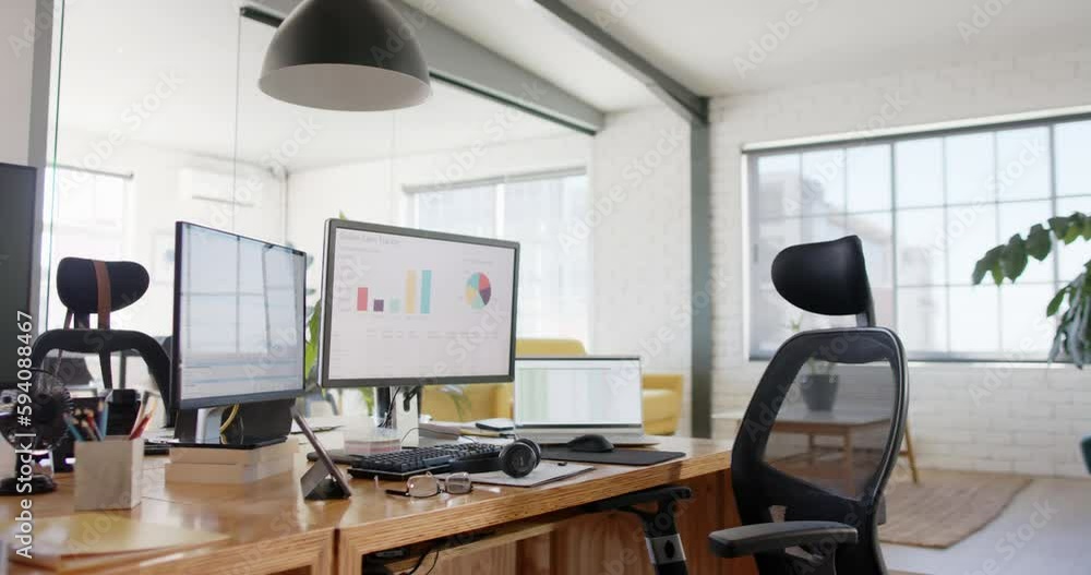 The watermark will not be included on Wall mural.: Empty modern office with graphs on computer screens and plants in pots on tables