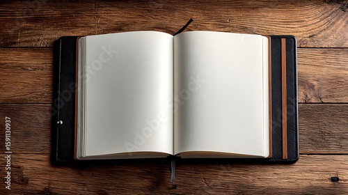 Wall mural empty notebook centered on classic wood grain floor with diffused light and copy space, ideal minima