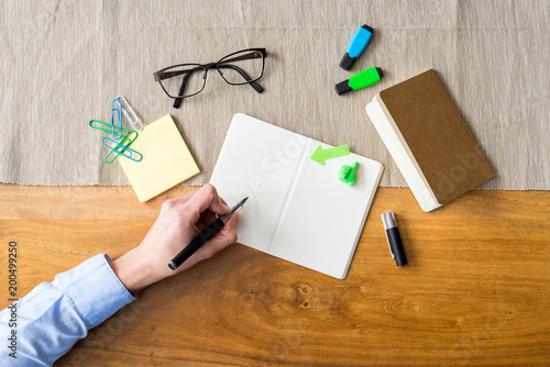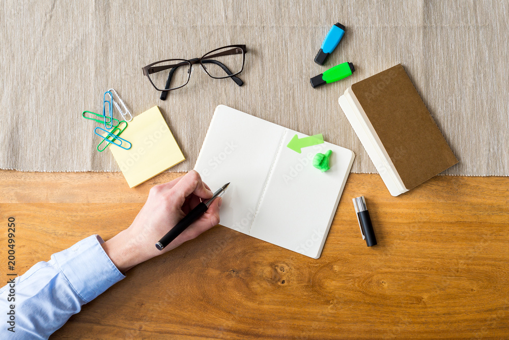 Wall mural empty notebook with copy space and hand as flat lay and template