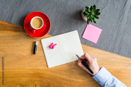 Wall mural empty notebook with copy space and hand as flat lay and template