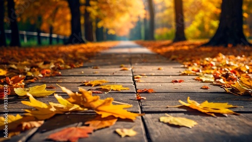 Wall mural empty pathway for mockups covered with colorful fallen leaves. unoccupied wooden path in autumn fore