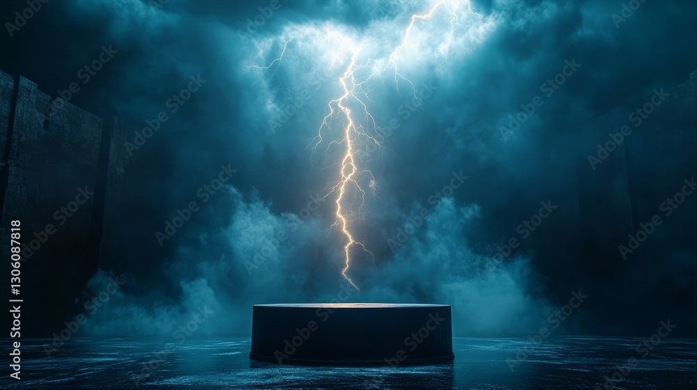 The watermark will not be included on Wall mural.: Empty podium with dramatic lightning flashes overhead, creating a tense and electrifying atmosphere