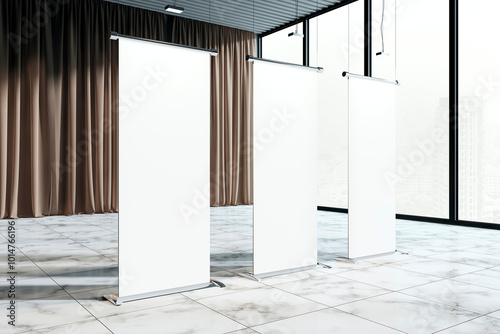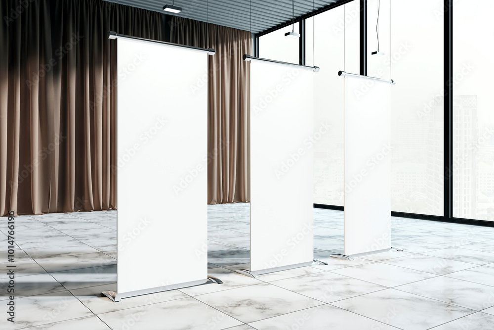 Wall mural empty roll-up banners in a modern exhibition space with curtains and large windows. 3d rendering