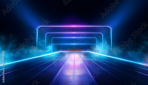 The watermark will not be included on Wall mural.: Empty stage for shows with neon lighting and haze in tilted angle