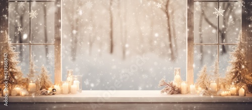 Wall mural : Empty table and winter window in background