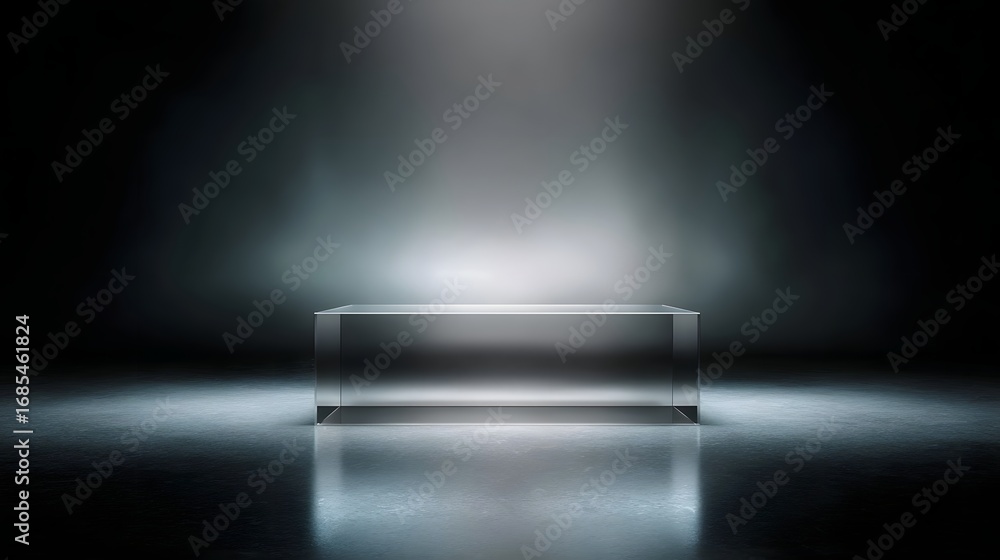 The watermark will not be included on Wall mural.: Empty transparent display stand with soft dramatic spotlighting on a reflective dark studio floor id
