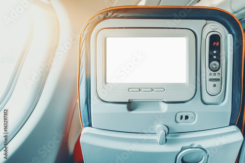 Wall mural empty white mock-up of aircraft multimedia screen with remote control, close-up view of blank placeh - Wall murals Wall mural empty white mock-up of aircraft multimedia screen with remote control, close-up view of blank placeh - Wall murals