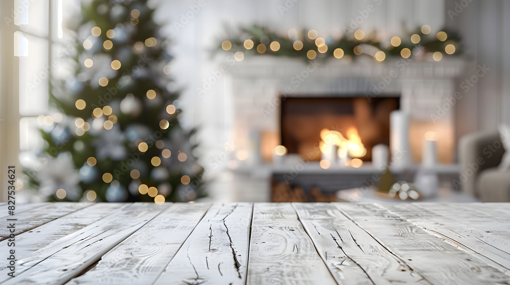 Wall mural empty wooden deck table on blurred white christmas background with tree and fireplace. backdrop for