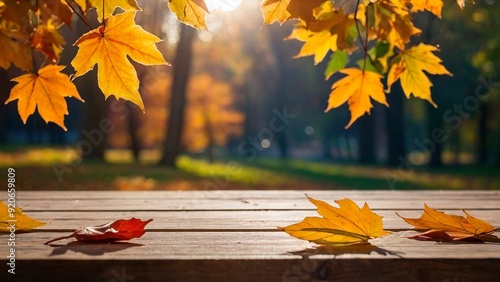 The watermark will not be included on Wall mural.: Empty wooden table for mockups - outdoor exposition exhibit platform with colorful fallen leaves - uno