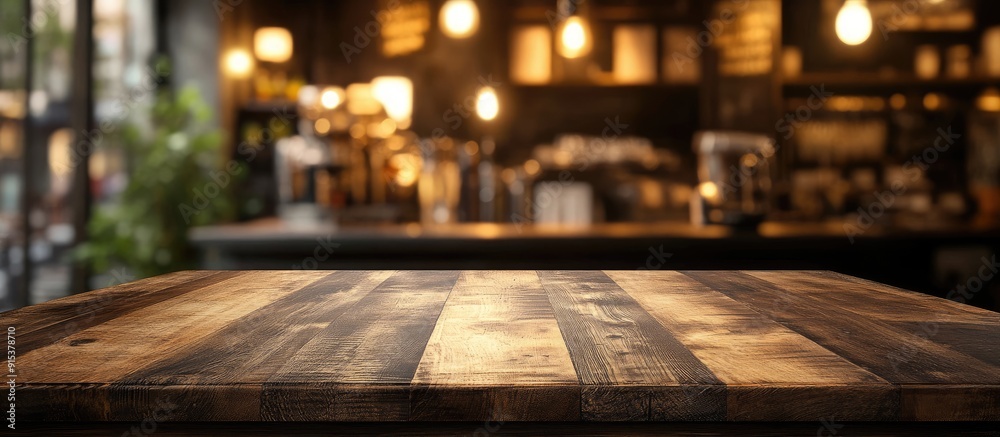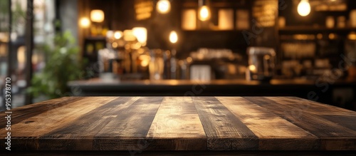 Wall mural empty wooden table in front of an abstract blurred coffee shop background the table can be used for