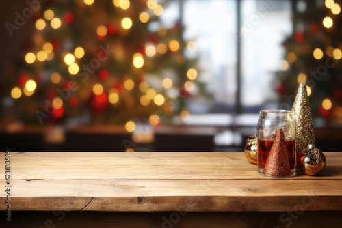Wall mural : Empty wooden table in front of christmas tree - space for text