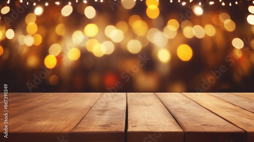 The watermark will not be included on Wall mural.: Empty wooden table top with lights bokeh on blur restaurant background - , generative ai