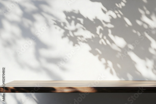 Wall mural empty wooden tabletop on white wall with tree shadow background for displaying product design