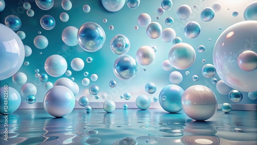 The watermark will not be included on Wall mural.: Enchanted aquatic sphere dreamscape iridescent orbs float serenely in a tranquil, reflective water s
