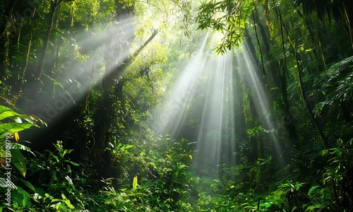 Wall mural enchanting forest with sunlight filtering through vibrant green trees creating a tranquil atmosphere