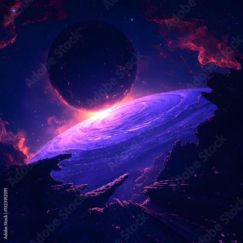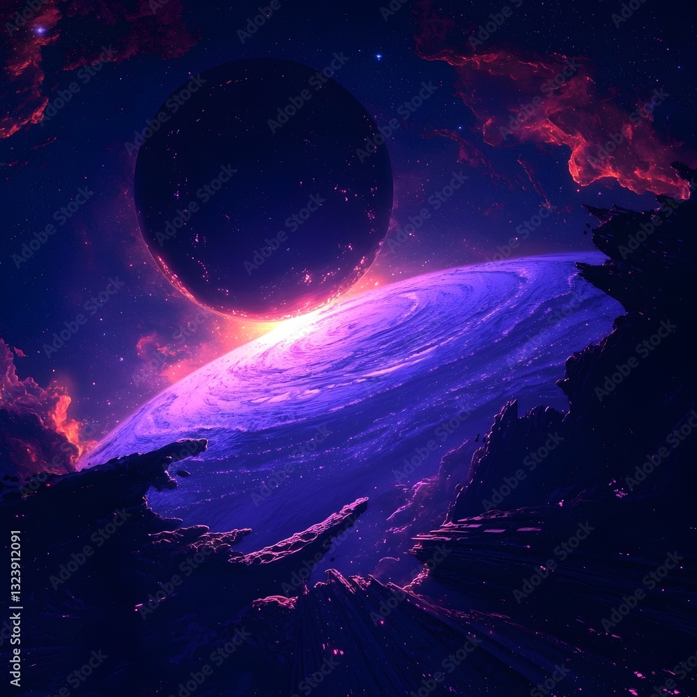 The watermark will not be included on Wall mural.: Enchanting hyper-realistic view of an unknown planet with a brilliant purple nebula illuminating the