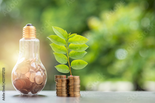 Wall mural energy saving. stacks of coins growing in light bulb and tree growing on stacks of coins and tree na
