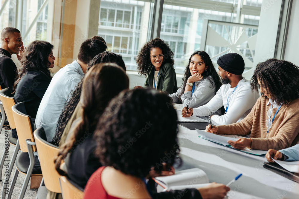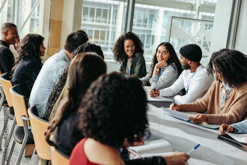 The watermark will not be included on Wall mural.: Engaging workshop with a diverse group participating in training at a professional setting