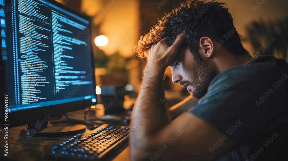 Wall mural engineer staring at computer screen, error message visible, coding environment, hands on keyboard. a - Wall murals Wall mural engineer staring at computer screen, error message visible, coding environment, hands on keyboard. a - Wall murals