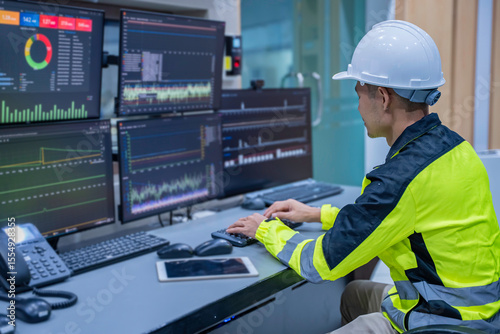 The watermark will not be included on Wall mural.: Engineer working at control room, manager control system, technician man monitoring program from a l
