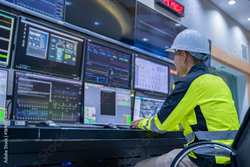 The watermark will not be included on Wall mural.: Engineer working at control room, manager control system, technician man monitoring program from a l