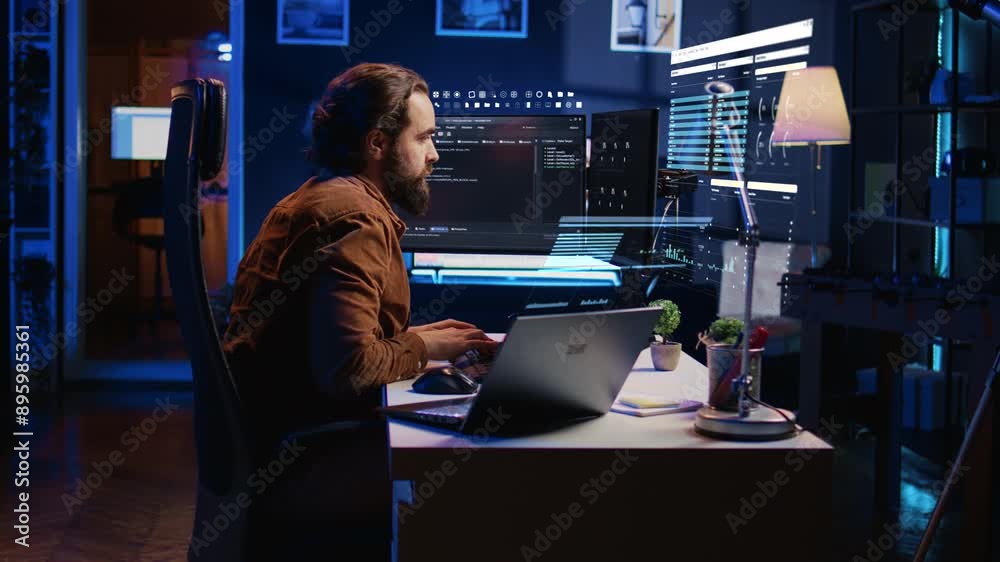 Wall mural engineer working on computer and laptop, using ar tech to do coding, drinking coffee. developer at h - Wall murals Wall mural engineer working on computer and laptop, using ar tech to do coding, drinking coffee. developer at h - Wall murals