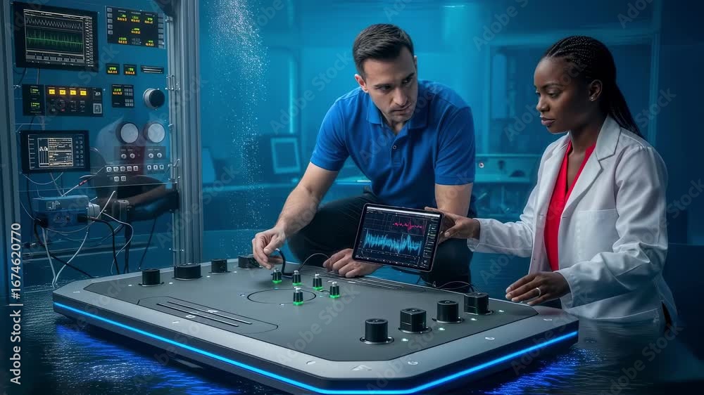Wall mural engineers calibrating sonar array signals on a submerged docking station prototype within a highfide - Wall murals Wall mural engineers calibrating sonar array signals on a submerged docking station prototype within a highfide - Wall murals