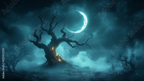 The watermark will not be included on Wall mural.: Enigmatic moonlit scene with a twisted tree