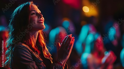The watermark will not be included on Wall mural.: Enthusiastic woman with glowing expression clapping during a vibrant evening event with dynamic colo