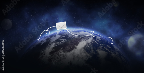 Wall mural envelope with letter flying over globe in space. flight path from one point to another. internationa - Wall murals Wall mural envelope with letter flying over globe in space. flight path from one point to another. internationa - Wall murals