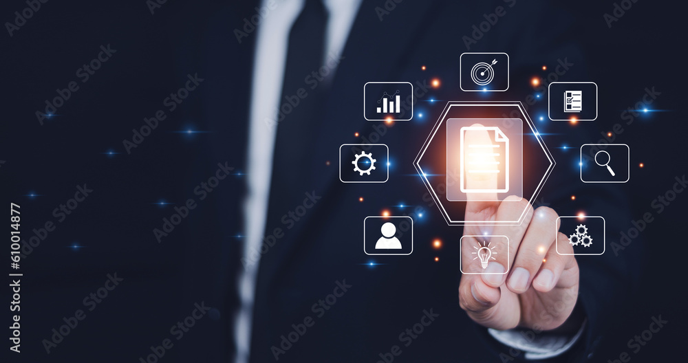 Wall mural erp document management, documents management information system concept, businessman using visual s - Wall murals Wall mural erp document management, documents management information system concept, businessman using visual s - Wall murals