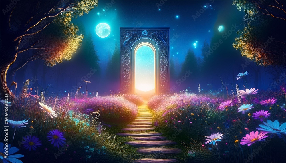 The watermark will not be included on Wall mural.: Ethereal doorway of light in a mystical nighttime meadow bioluminescent flowers and floating spirit
