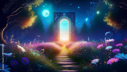 Wall mural ethereal doorway of light in a mystical nighttime meadow bioluminescent flowers and floating spirit